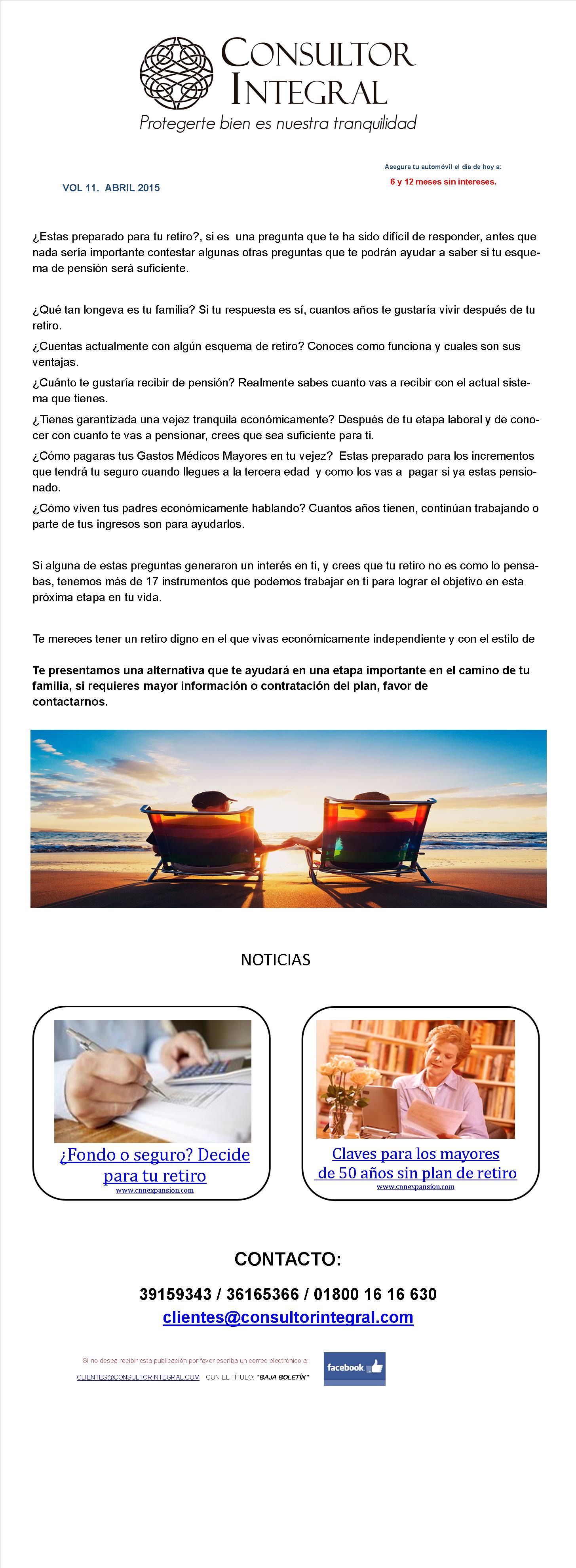 Retiro Junio 2015 por consult7 | Jun 1, 2015 | Boletines, Plan de Retiro | 0 Comentarios Enviar comentario Cancelar la respuestaTu dirección de correo electrónico no será publicada. Los campos obligatorios están marcados con *Comentario * Nombre * Correo electrónico * Web Guarda mi nombre, correo electrónico y web en este navegador para la próxima vez que comente.